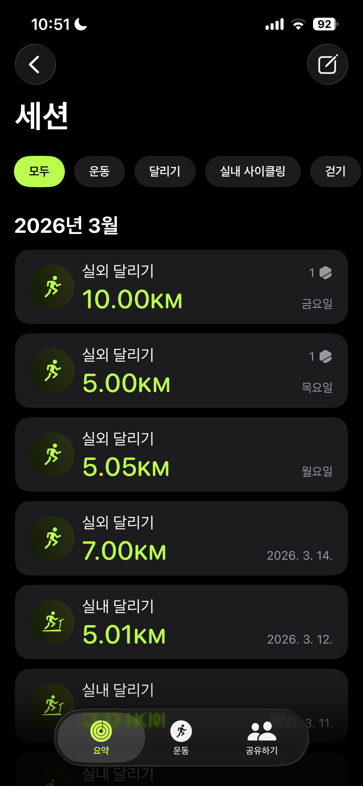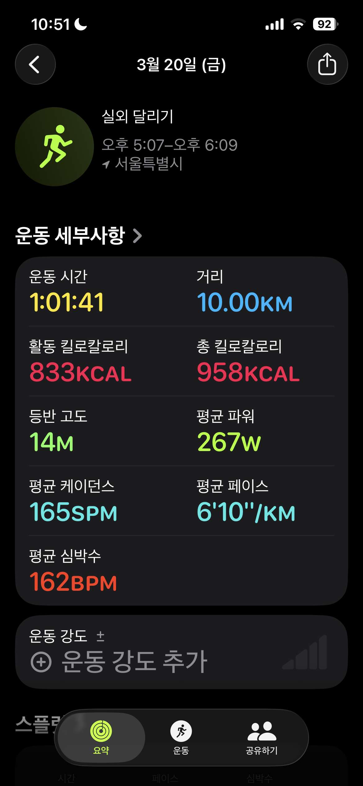 - 금요일: 10km — 평균 페이스 6분 10초, 1시간 1분 41초 완주
