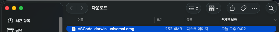 1단계 — 다운로드된 .dmg 파일을 더블클릭합니다.