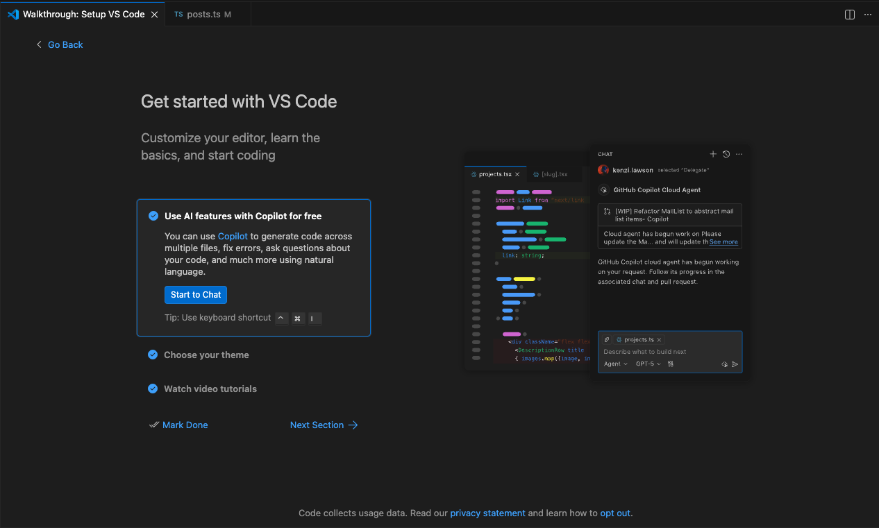 VSCode를 처음 실행하면 GitHub Copilot 설정 화면이 바로 뜹니다. 저도 처음엔 이게 뭔지 몰라서 어떤 걸 눌러야 할지 한참 고민했어요.