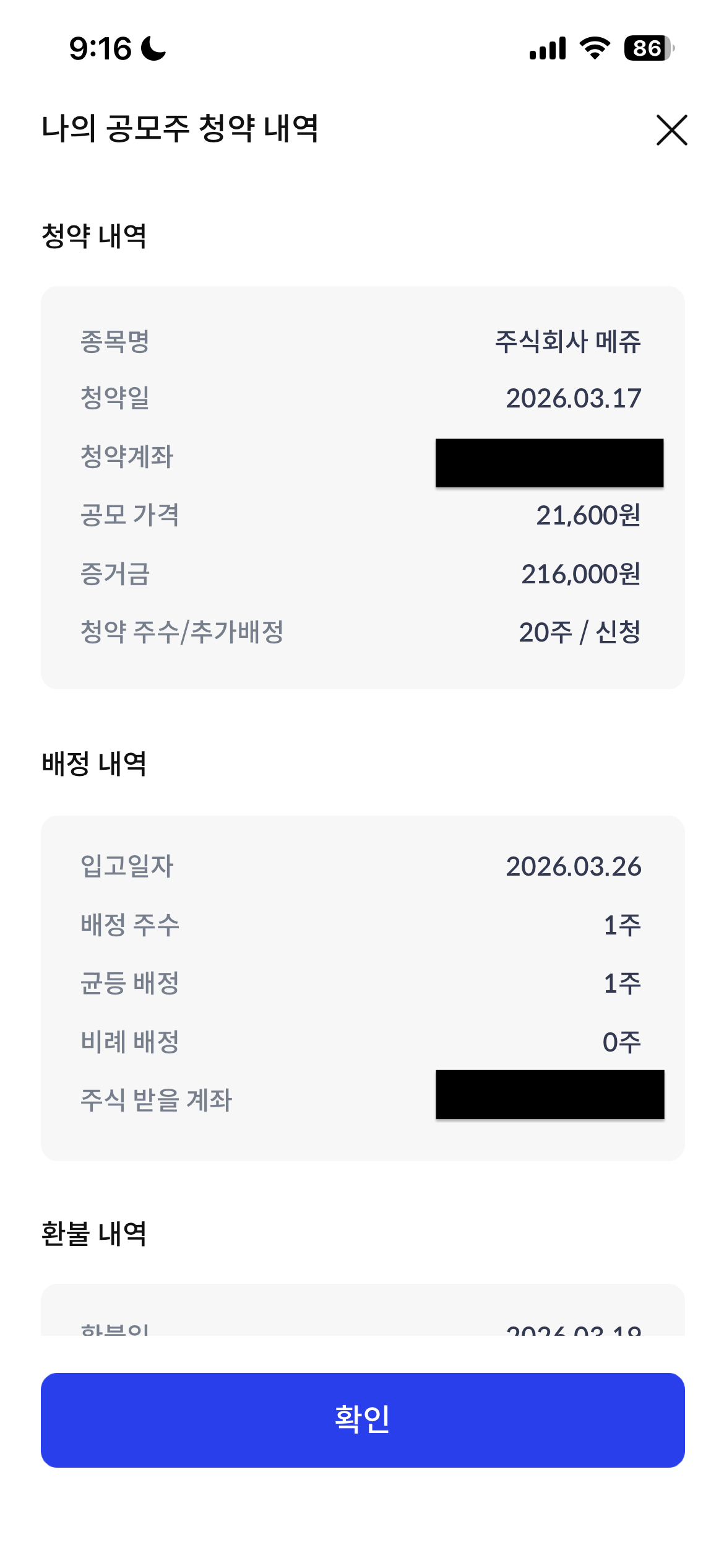 솔직히 둘 다 경쟁률이 높을 것 같아서 기대를 많이 안 했는데, 메쥬에서 1주라도 받아서 다행이에요. 주변 친구들 중에는 둘 다 0주를 받은 경우도 많았거든요.
